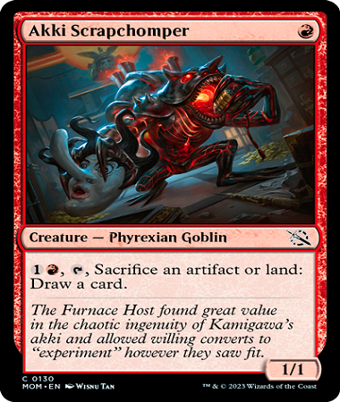 A segunda carta vermelha que falarei é a uma criatura que por uma R 1/1 tem o poder de no sacrifício de um artefato ou land o jogador compra um card. É claro que não é uma criatura feita pra early game mas no late game provavelmente será bem útil ao sacrificar pedrinhas e comprar cartainhas. Talvez 1 ou 2 cópias no Boros synthesizer.