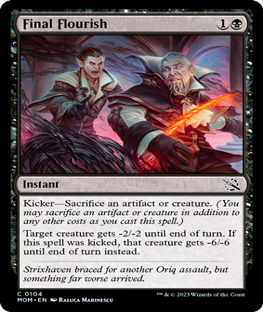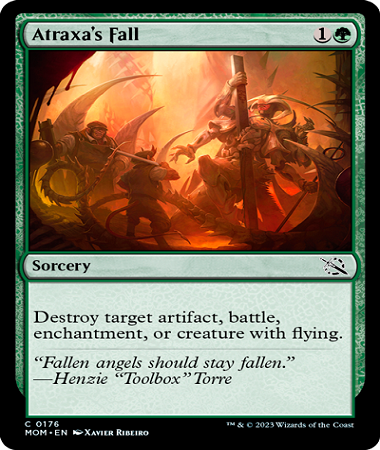 Agora falarei sobre as cartas pauper de Marcha das máquinas da minha cor predileta, a verde, e a carta é a . É um tipo de carta que pode ter espaço graças a versatilidade dela e em vez do Bogle utilizar 4 slots de side, pode utilizar apenas 2 slots com uma carta que vai destruir 4 tipos de cartas diferentes. Uma outra coisa interessante que me chamou a atenção desta carta é a flavor da queda de Atraxa, como estou feliz “Fallen angels should stay fallen”.
