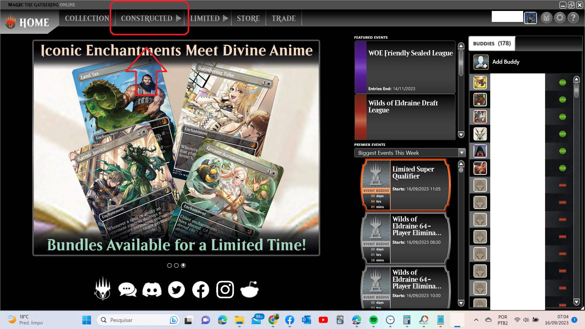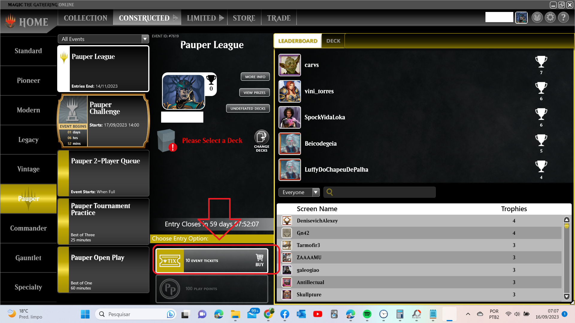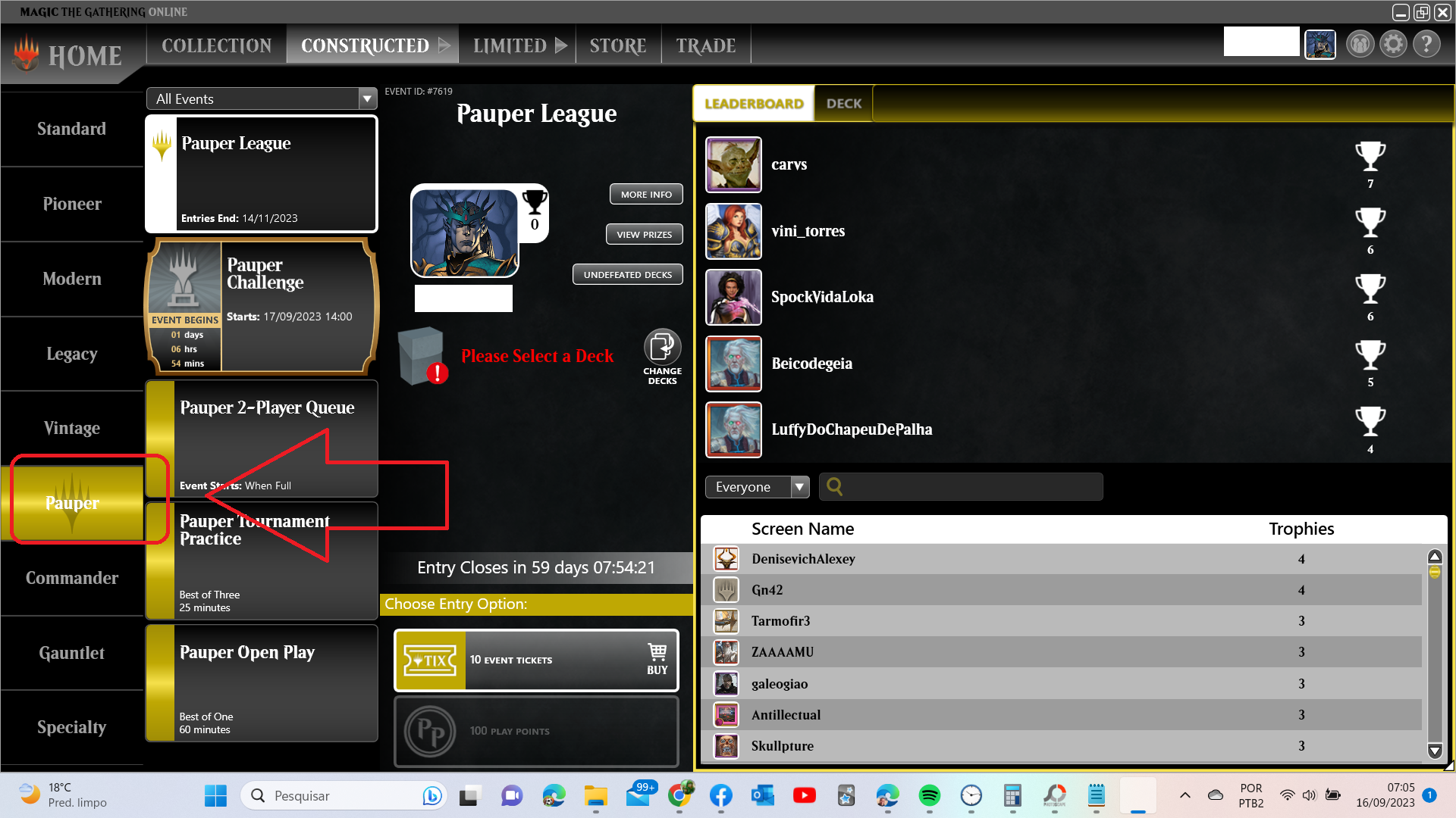 Click na Aba Constructed e vai abrir o Hall dos construídos e em seguida click no formato de exemplo aqui(Pauper). Siga o print!