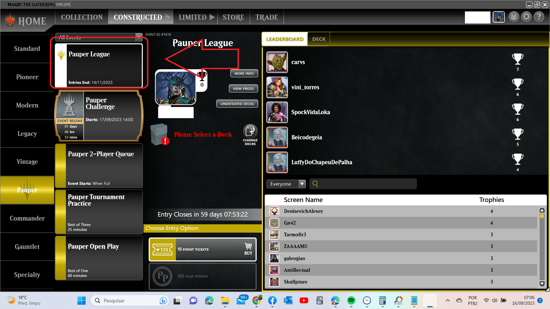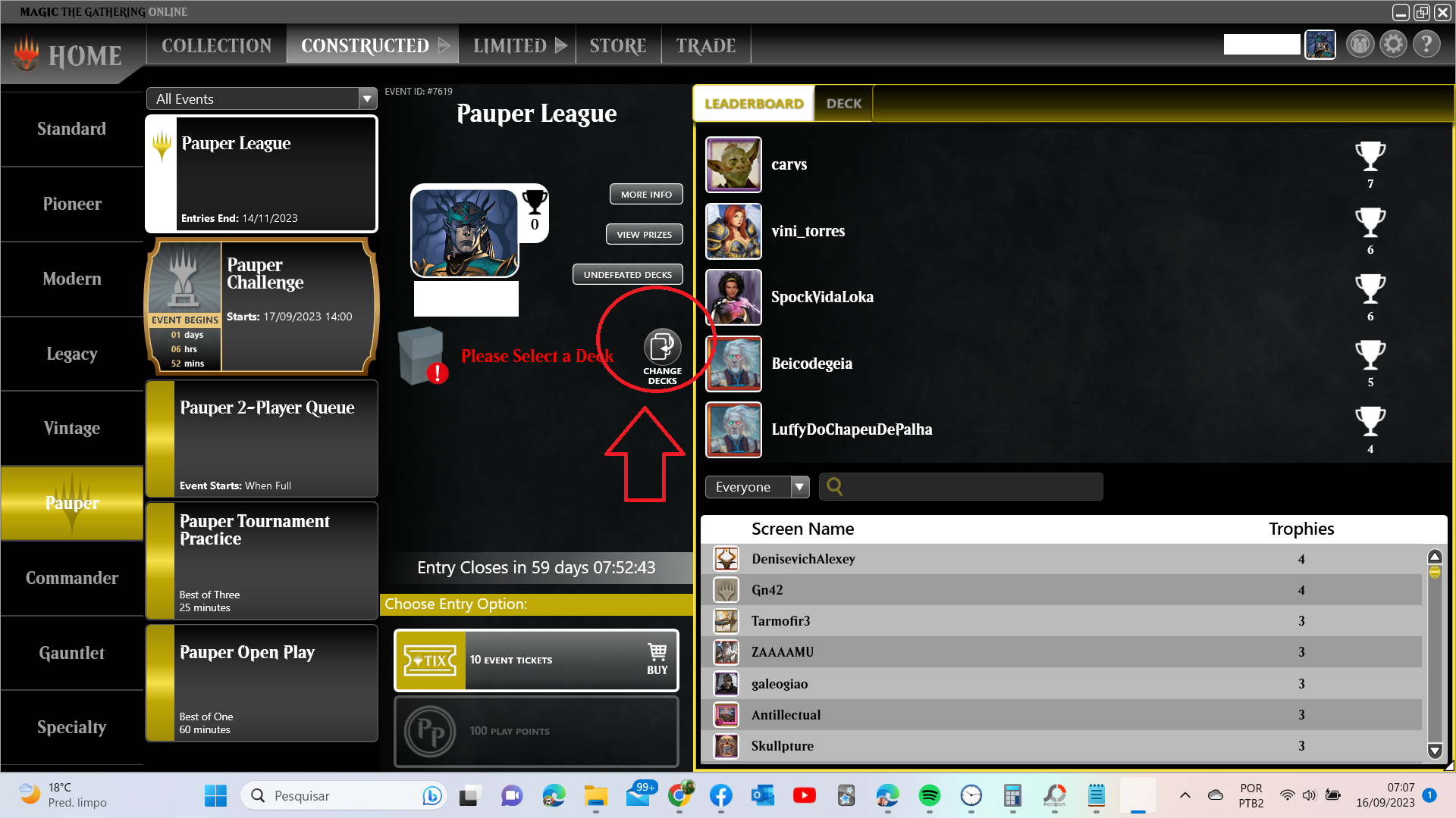 Agora click em Change deck e escolha o deck Pauper de preferência que você tenha uma certa afinidade e treinamento.